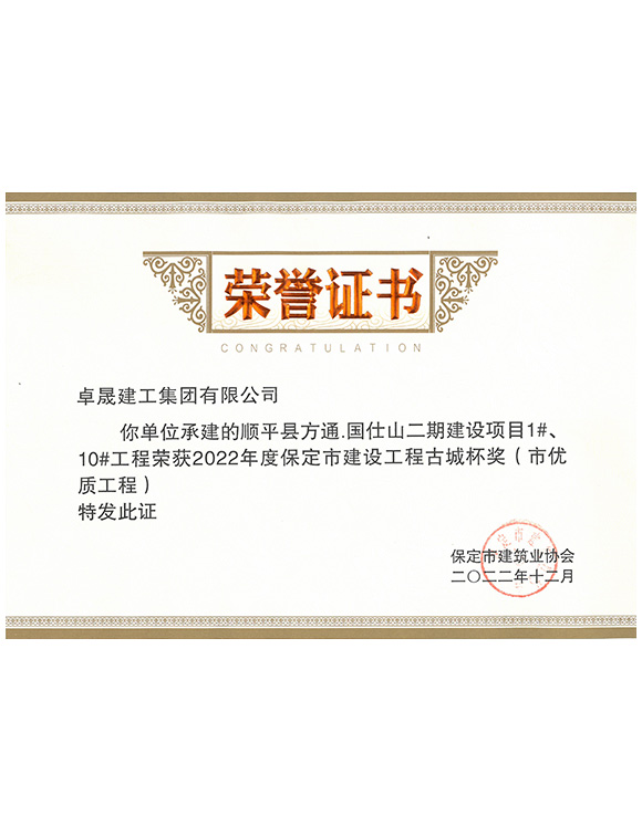 2022Äê12Ô ÈÙ»ñ¡°±£¶¨ÊÐÐÞ½¨¹¤³Ì¹Å³Ç±½±£¨ÊÐÓÅÖʹ¤³Ì£©¡±